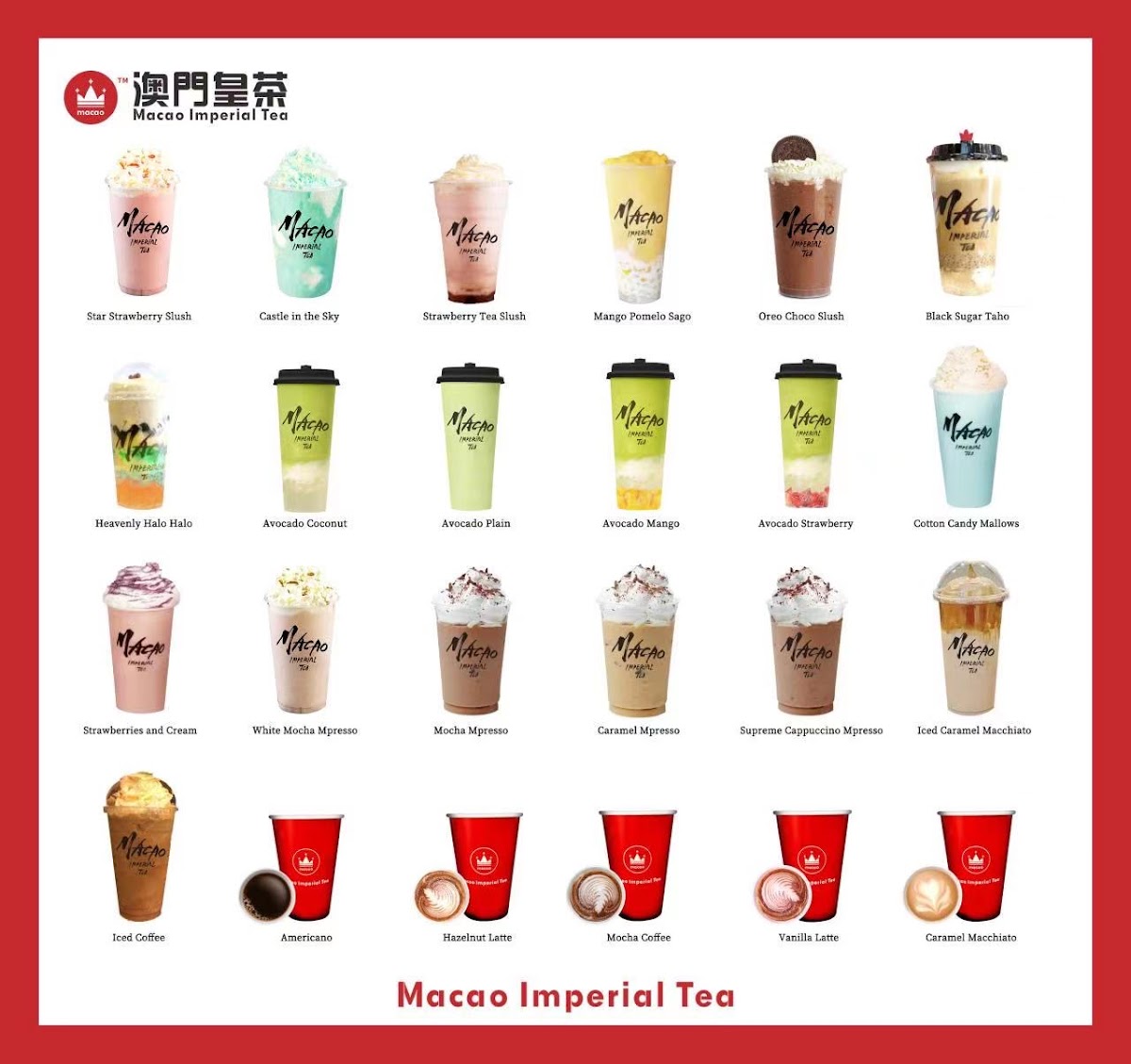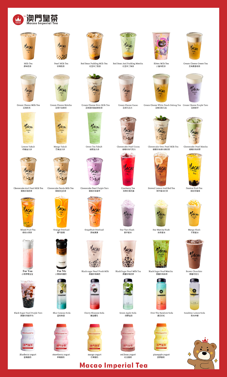 At Macao Imperial Tea Leduc, the menu lets you explore a range of creative bubble tea and drink options that balance classic flavours with playful twists. The Cream Cheese Series highlights richer tastes with offerings like Cream Cheese Green Tea ($8.59), Cream Cheese Oreo Milk Tea ($8.59), Cream Cheese Purple Taro ($8.59), Cream Cheese Cocoa ($8.59) and Cream Cheese Milk Tea ($8.59), all delivering a creamy, velvety finish that reviewers often praise. Meanwhile, the Black Sugar Series brings bold sweetness to favourites such as Black Sugar Pearl Milk Tea ($8.59), Black Sugar Pearl Cocoa ($8.59), Black Sugar Pearl Purple Taro ($8.59) and Black Sugar Pearl Fresh Milk ($8.59), each enriched with chewy pearls for texture. Paired with this are other enticing choices like refreshing fruit teas, sodas, slushies, and specialty drinks, providing a satisfying mix of sweet, creamy, and refreshing options that round out a diverse menu suited to both bubble tea purists and adventurous sippers alike.